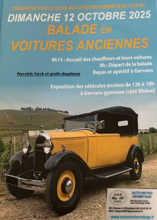 Il faudra faire chauffer les chevaux lors d’une belle promenade , un repas à partager et des discutions entre des amoureux de vieilles mécaniques . Inscrivez vous , on vous attend par téléphone 06/10/65/52/19 ou mail chanas.andre@wanadoo.fr .